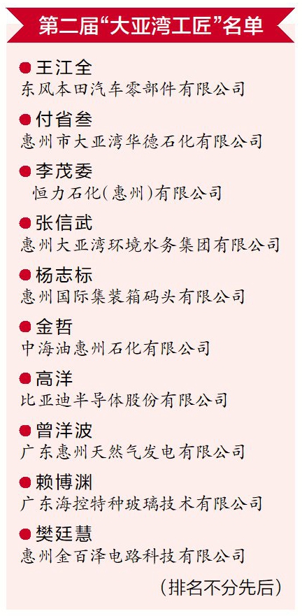 惠州日?qǐng)?bào)訊 (記者匡湘鄂)日前,大亞灣開發(fā)區(qū)第二屆“大亞灣工匠”評(píng)選結(jié)果出爐,東風(fēng)本田汽車零部件有限公司王江全等10人獲“大亞灣工匠”稱號(hào)。