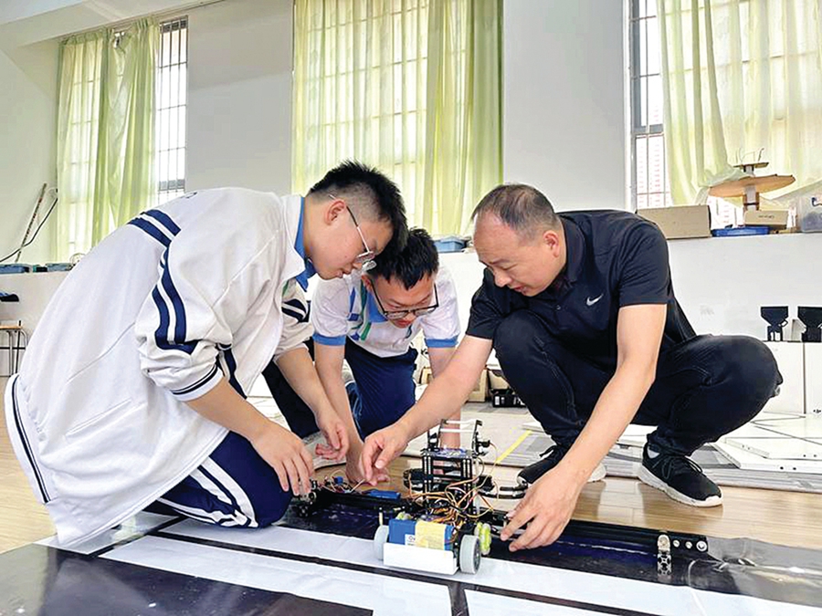 教師指導(dǎo)學(xué)生進(jìn)行機(jī)器人搭建與調(diào)試;葜萑?qǐng)?bào)記者黃旭新 攝