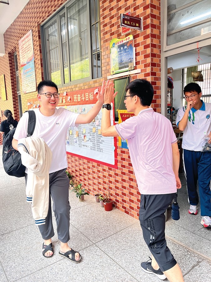 “老師相信你,一定沒有問題的……”正式開考前,在大亞灣第一中學(xué)里,教師張素丹與其他教師一起身穿紫色T恤與學(xué)生擊掌擁抱!斑@身衣裳寓意著老師對學(xué)生們的祝福!睆埶氐ふf,高考首日老師們身穿紅旗袍祝愿學(xué)子金榜題名、旗開得勝;第二天身穿紫色T恤表達(dá)紫氣東來的祝福!皩W(xué)生們精神面貌不錯,從他們的笑容里我看到了信心和對未來的期盼!睆埶氐ふf。