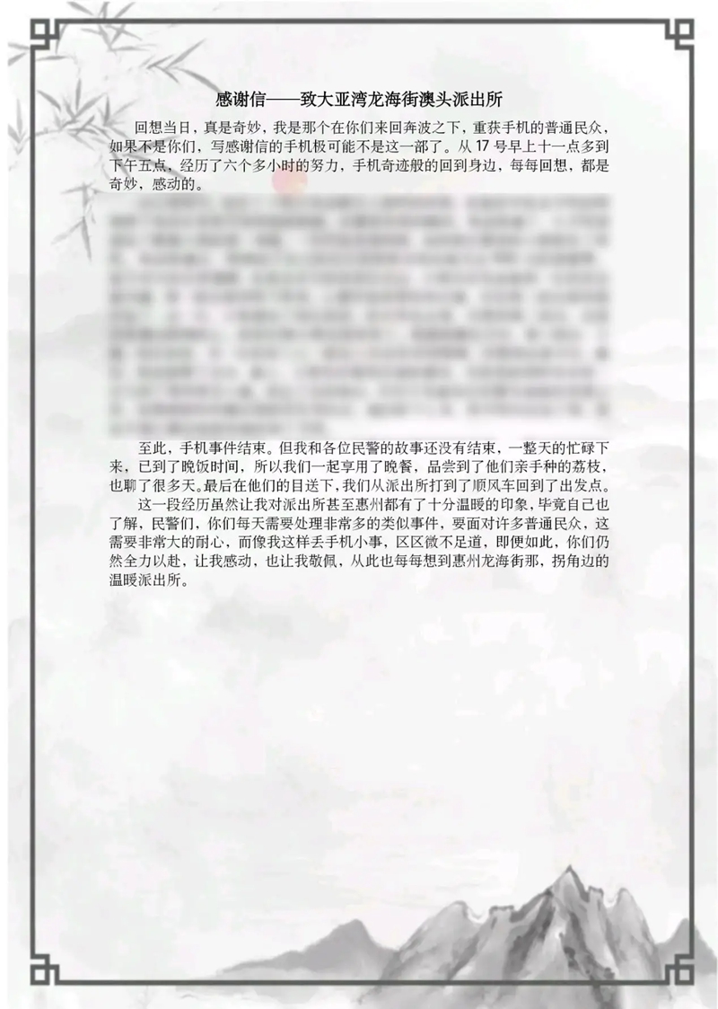 失主林女士的感謝信。最后,范東榮將尋回的手機(jī)交到林女士手中,林女士看到失而復(fù)得的手機(jī)非常激動(dòng),大贊澳頭派出所民警的業(yè)務(wù)能力。