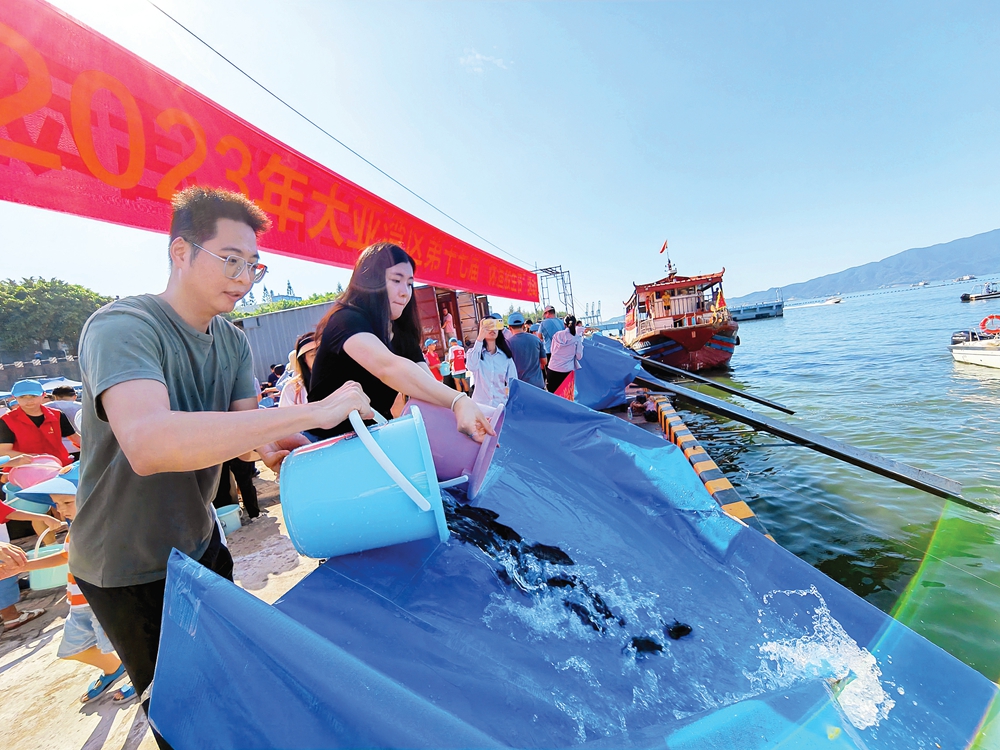 惠州日報訊 (記者匡湘鄂 通訊員陳志敏)日前,大亞灣區(qū)第十七屆“休漁放生節(jié)”增殖放流活動在中海碼頭舉行。大亞灣開發(fā)區(qū)社會事務(wù)管理局、省海洋漁業(yè)試驗中心、大亞灣水產(chǎn)資源保護(hù)區(qū)管理處、區(qū)屬有關(guān)單位干部職工以及漁村群眾、志愿者、學(xué)生代表等共100多人參加活動。本次增殖放流活動共投放斜帶石斑(青斑)、斑節(jié)對蝦等魚蝦苗433萬尾。