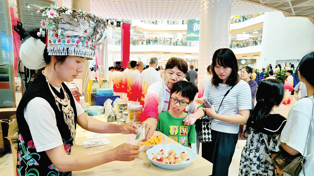 晴隆茶、黃桃、紅心獼猴桃、布依族蠟染服飾……兩天來,黨群“山海同心”工程展示館的市民絡(luò)繹不絕,人們紛紛停住腳步,在這里品嘗芬芳四溢的晴隆茶和水果,體驗(yàn)獨(dú)具特色的民族服飾。
