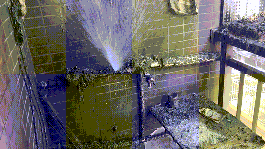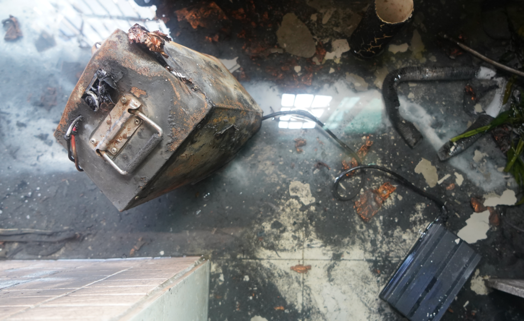 電瓶燃燒燒破陽臺pvc水管,水管噴灑出水將火情控制,火勢未進一步擴大。事發(fā)后內(nèi)部墻體被濃煙嚴重熏黑,現(xiàn)場一片狼藉,所幸未造成人員傷亡。