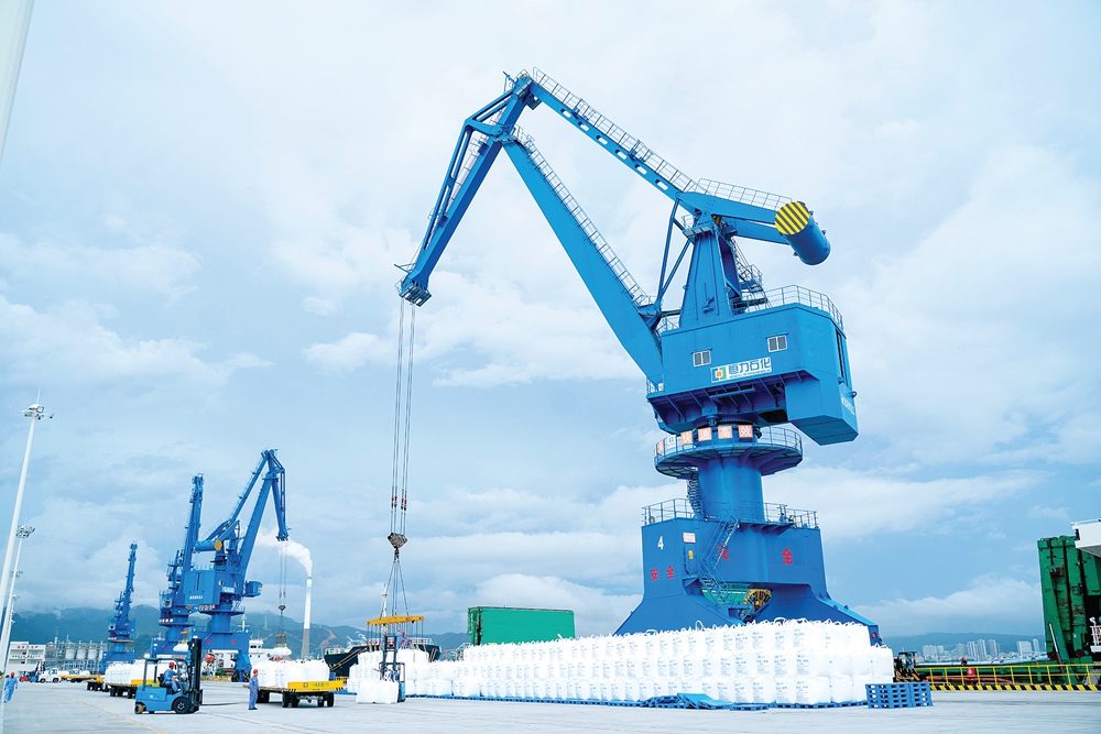 離PTA主裝置區(qū)約一公里處,便是恒力石化(惠州)有限公司通用碼頭。碼頭上是項(xiàng)目最繁忙的地方,只見(jiàn)一輛輛拖車(chē)將一包包PTA產(chǎn)品拉到碼頭上有序碼垛好;碼頭泊位上停靠著3艘輪船,高大的門(mén)機(jī)起重機(jī)將碼垛好的PTA產(chǎn)品吊到船艙。