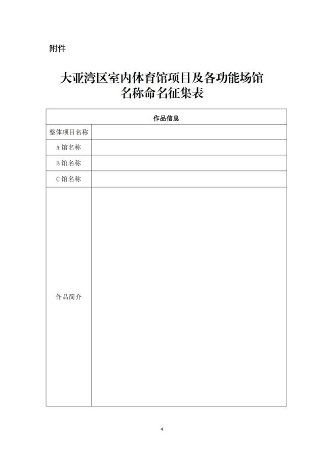 。ㄒ唬┩陡逭唔毺顚憽洞髞啚硡^(qū)室內(nèi)體育館項目及各功能場館名稱命名征集表》,提交電子文檔或紙質(zhì)文檔。