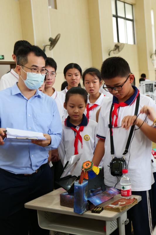 “小科學(xué)家”向評委們展示自己的作品。 惠州日報記者張宇琪 通訊員杜雯 攝
