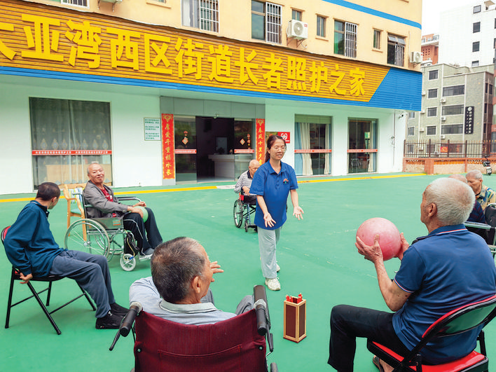 “您真棒,把球再拋給我好嗎?”“對,就是這樣,再來一個……”日前,記者來到“第一養(yǎng)老”大亞灣西區(qū)街道長者照護之家(以下簡稱“照護之家”),秋日陽光下,朱殊怡和護理員正陪老人們在院子里做晨間運動,一派其樂融融。