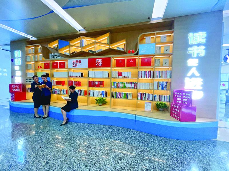 明媚的陽光透過玻璃窗灑在室內(nèi),手邊的咖啡正散發(fā)著濃郁的香氣,選一本書落座,享受閱讀帶來的寧靜時刻。近日,創(chuàng)新大廈黨建文化書吧較之以往熱鬧了不少,許多職工在空閑時間來此借閱書籍。
