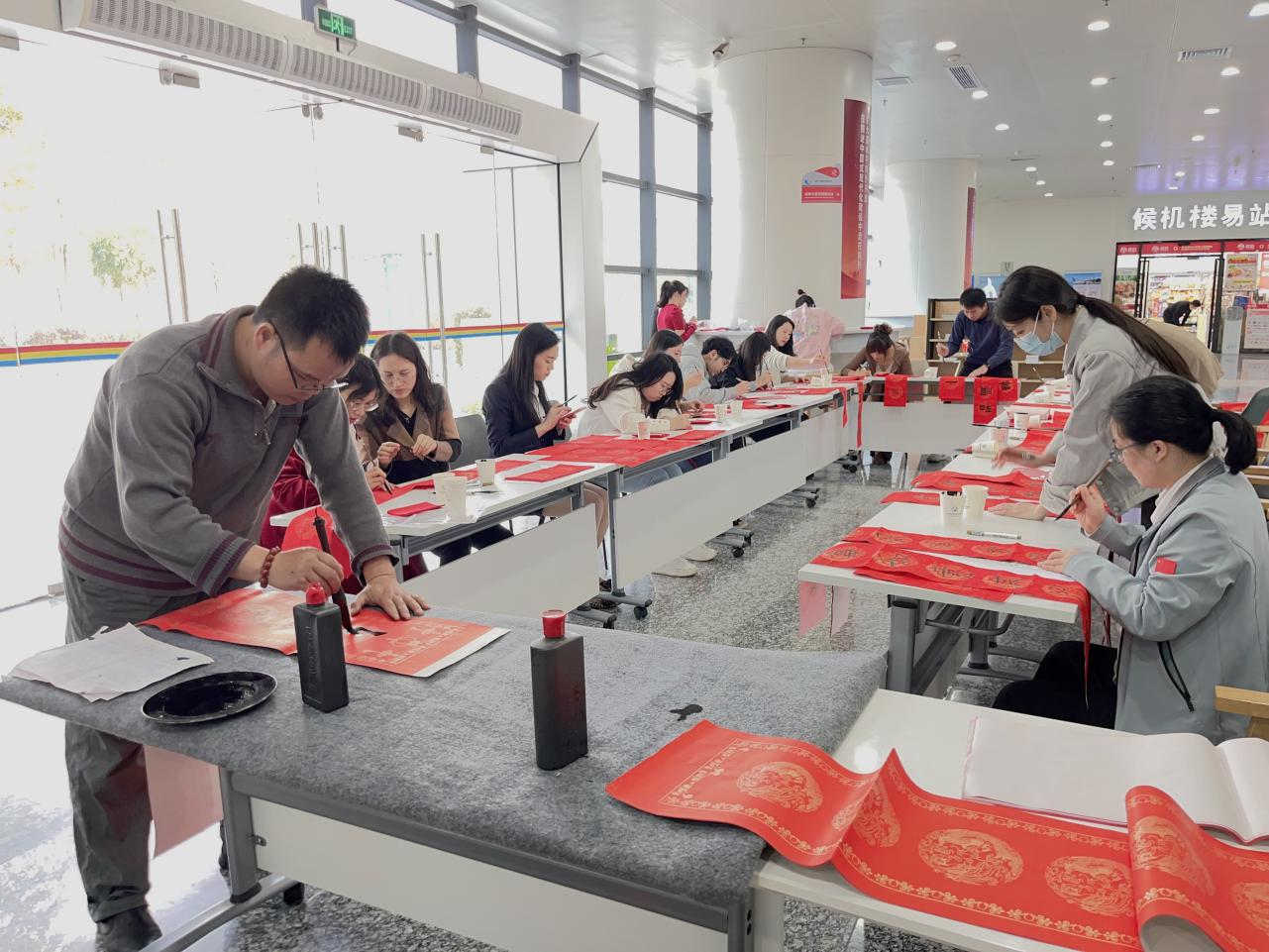 丹紙鋪就,翰墨飄香;顒(dòng)中,中國青年美術(shù)家協(xié)會(huì)會(huì)員、廣東省中國畫協(xié)會(huì)會(huì)員、惠陽區(qū)硬筆書法家協(xié)會(huì)秘書長陳劍現(xiàn)場指導(dǎo)大家書寫春聯(lián)。在場的黨員、群眾在老師的指導(dǎo)下?lián)]毫潑墨,一副副春聯(lián)、一張張福字飽含著迎接新春的喜悅。“我還是喜歡手寫的春聯(lián),既有墨香,更有年味!迸踔约盒膬x的春聯(lián)和福字,職工蔡女士的喜悅之情溢于言表。