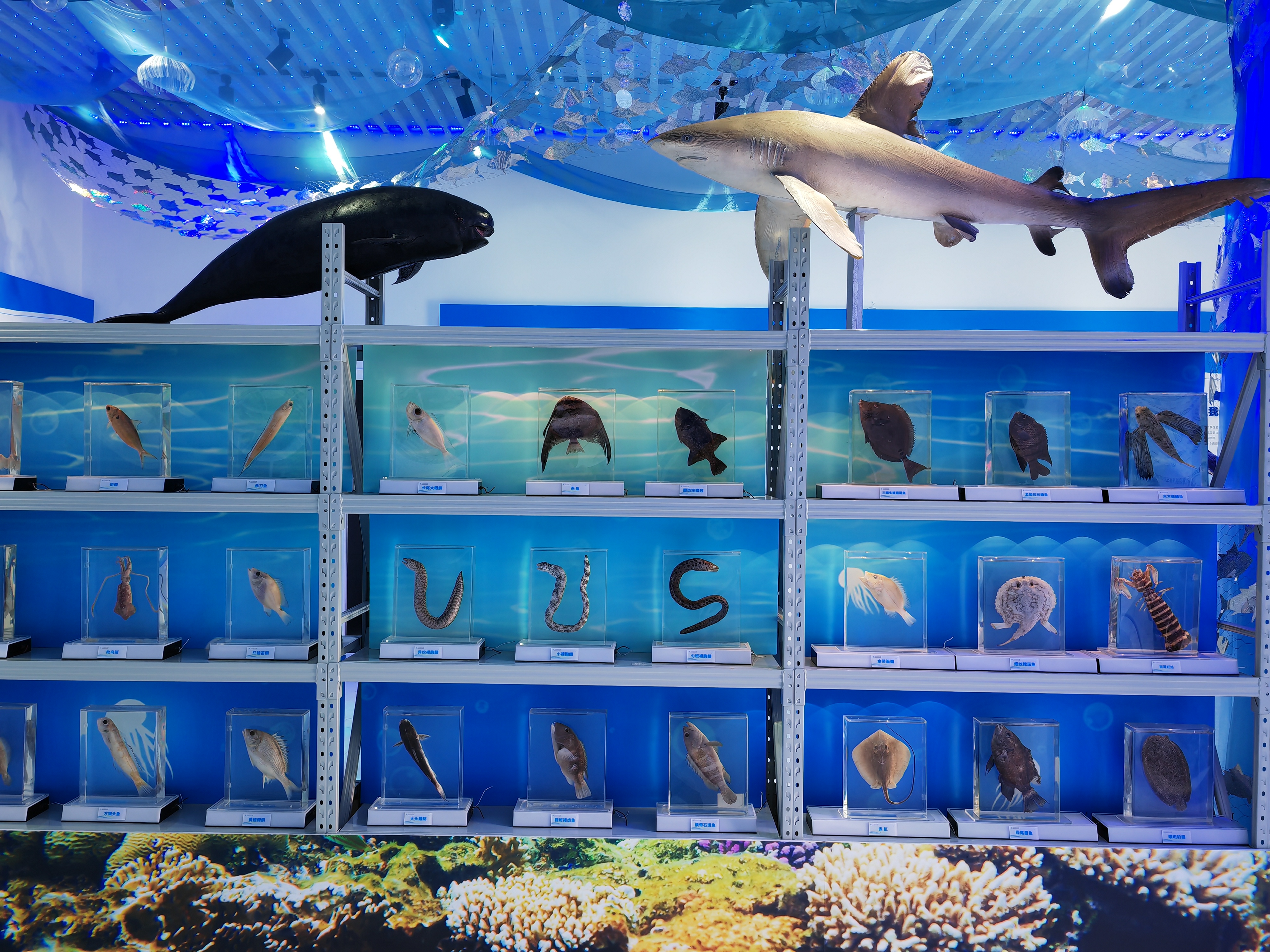標(biāo)本柜上展出80多種海洋生物標(biāo)本