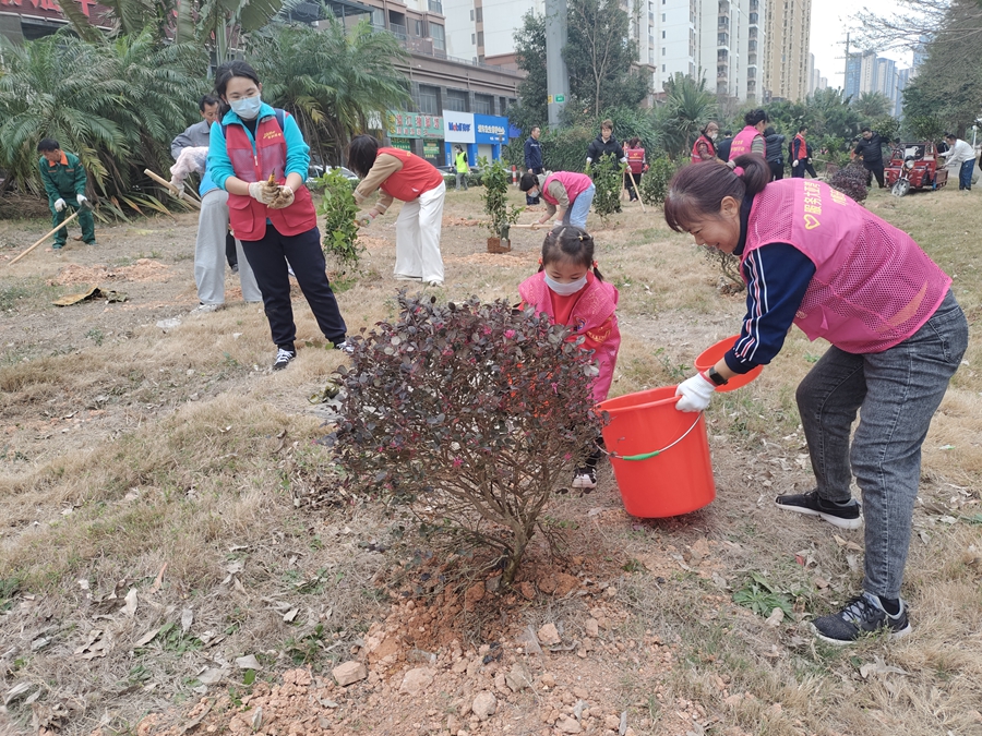 2月28日下午,在西區(qū)街道錦惠社區(qū)錦地繁花小區(qū)的一塊空地上,來自區(qū)公安分局、街道駐村辦、社區(qū)等機(jī)關(guān)單位的工作人員和社區(qū)黨員群眾約80人在此開展植樹活動。大家干勁十足,有的扶正樹苗、有的揮鍬挖坑、有的壓實回填、有的提水澆灌,現(xiàn)場忙碌而有序,大家用汗水和熱情為社區(qū)增添了一抹盎然生機(jī);顒庸苍苑N桂花、茶花(紅)和紅花檵木球等各50棵。