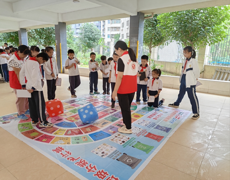 志愿者帶領(lǐng)小朋友參與垃圾分類飛行棋游戲。