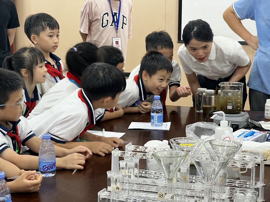 同學(xué)們對(duì)污水凈化裝置的神奇效果贊嘆不已。 惠州日?qǐng)?bào)記者張宇琪 通訊員董奕豪 別夢(mèng)蝶 攝