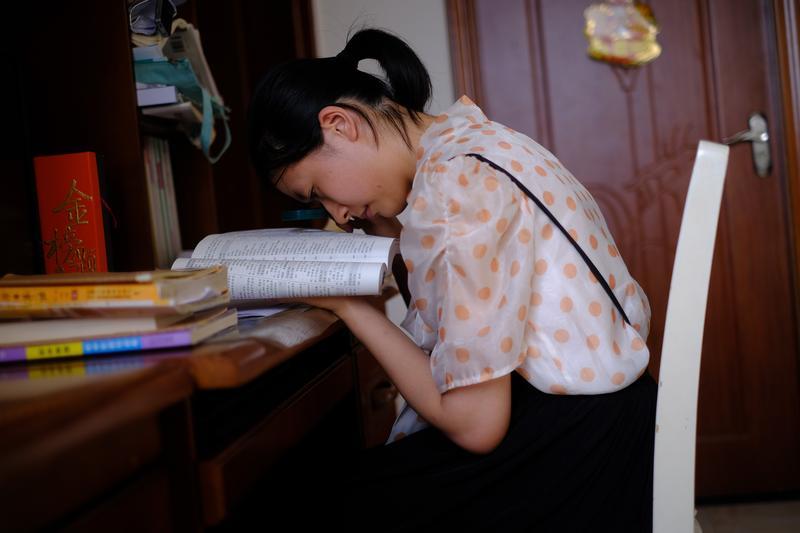 駱梓儀依靠放大鏡研究志愿填報相關(guān)書籍。