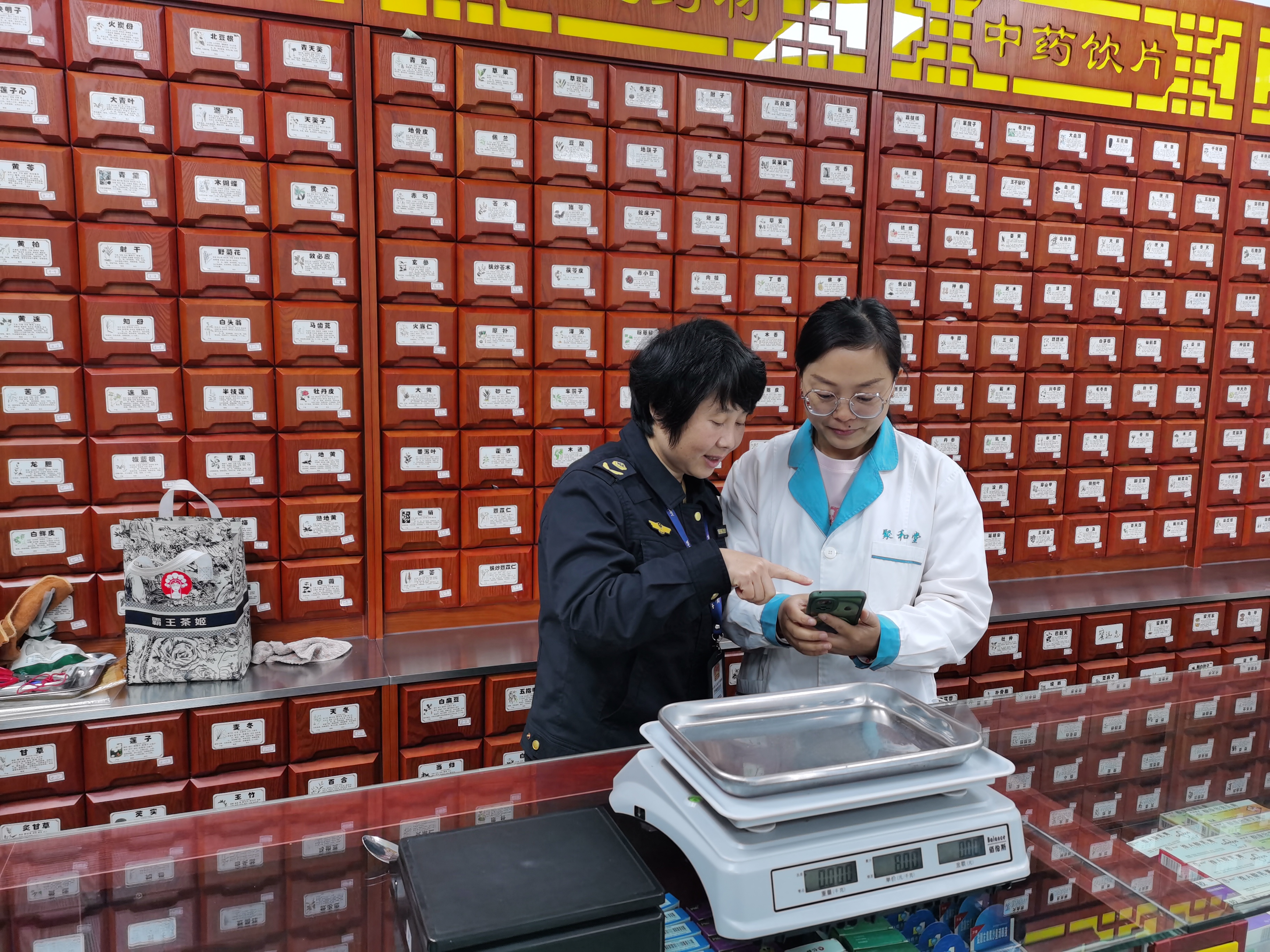 執(zhí)法人員指導駐店藥師使用“云巡查”。 (資料圖片)