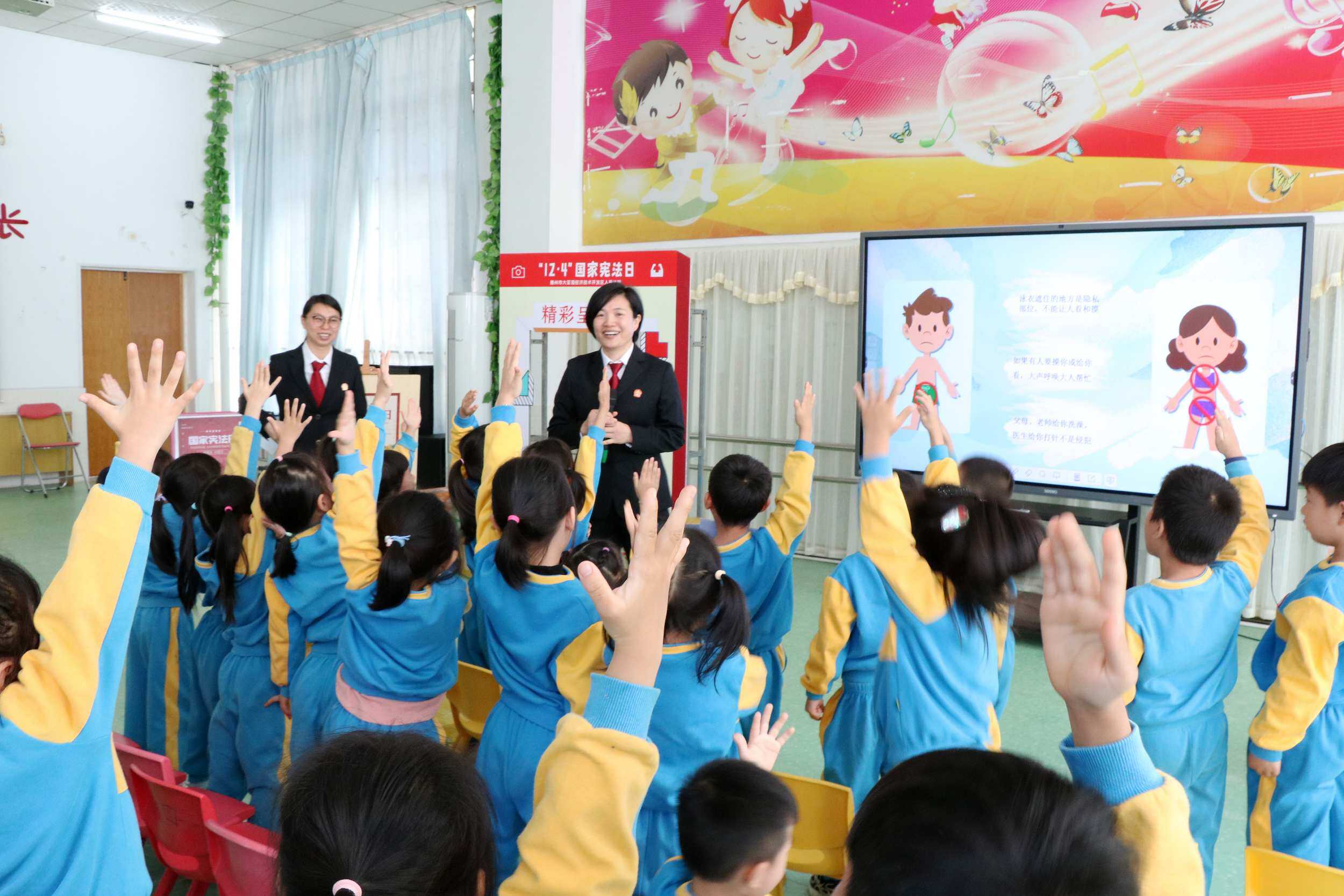 當(dāng)法官走下審判高臺(tái),走進(jìn)幼兒園,面對(duì)40名小萌娃上課,是一種怎樣的體驗(yàn)?望著教室里兩位穿著制服的阿姨,萌娃們睜大了好奇的眼睛!靶∨笥褌兒茫∥覀兪莵(lái)自大亞灣法院的法官阿姨!”大亞灣經(jīng)濟(jì)技術(shù)開發(fā)區(qū)人民法院綜合審判庭法官徐黎指著胸口上的法徽,解答了孩子們的疑惑。12月3日,在第11個(gè)國(guó)家憲法日來(lái)臨之際,大亞灣區(qū)法院走進(jìn)大亞灣西區(qū)中心幼兒園,為40名兒童上了一堂知識(shí)與童趣相碰撞的法治啟蒙課。