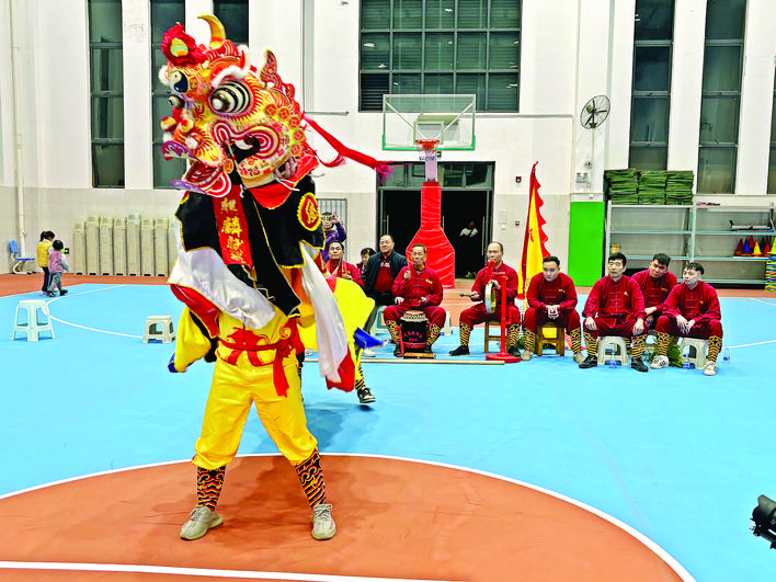 盡管獅套還不算十分完整,但是隊(duì)員們努力將成果展示在村民面前。匯演現(xiàn)場,伴隨著鏗鏘有力的鑼鼓,一頭活蹦亂跳的“麒麟獅”率先“闖”進(jìn)了場館。一開始搖頭擺尾,左顧右盼;一會兒又高高騰起,活蹦亂跳;一會兒到處“覓食”,歡快起舞……隊(duì)員們將麒麟獅活潑可愛又憨態(tài)可掬的形態(tài)表現(xiàn)出來。
