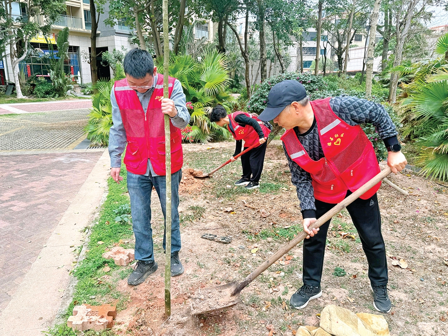 志愿者參加義務(wù)植樹活動(dòng)。