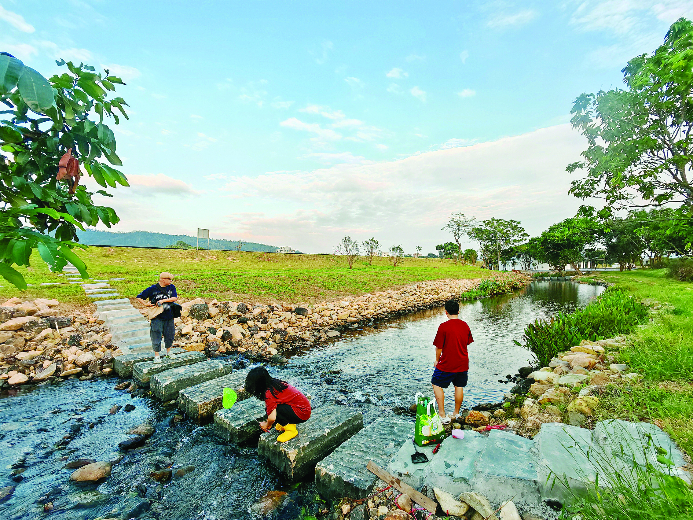青龍河畔原本荒廢的耕地已全面翻耕,重現(xiàn)生機(jī)。河岸邊修建了平整的機(jī)耕道,也是一條農(nóng)業(yè)觀光步道。沿著這條嶄新的步道漫步,只見清澈的河水緩緩流淌,水面波光粼粼,美人蕉等水生植物與清澈的河水相映成趣。河面上的幾處汀步,方便行人過河,也成為河流小景。原本雜亂的河岸鋪上了草皮,錯落有致地種植著花草。岸邊原有的荔枝樹郁郁蔥蔥,為人們提供了一片清涼的綠蔭。