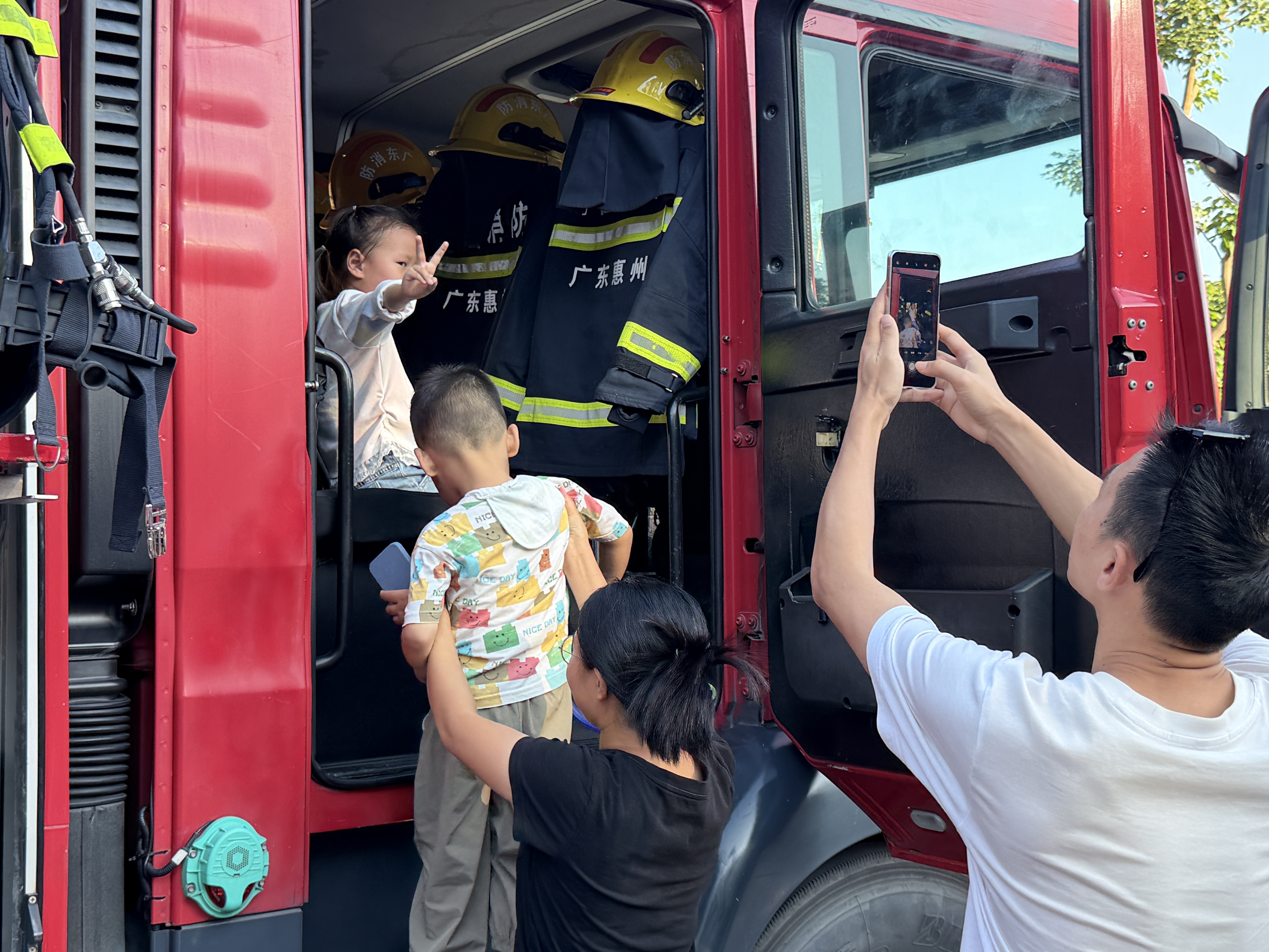 接著,消防員引導(dǎo)大家來到廣場近距離參觀消防車。消防員耐心細(xì)致地打開了消防車的各個(gè)功能分區(qū),向大家介紹了隨車配備的破拆工具、空氣呼吸器、水帶等各種專業(yè)裝備,并講解與互動(dòng)問答,為居民們解開了消防裝備的“神秘面紗”。