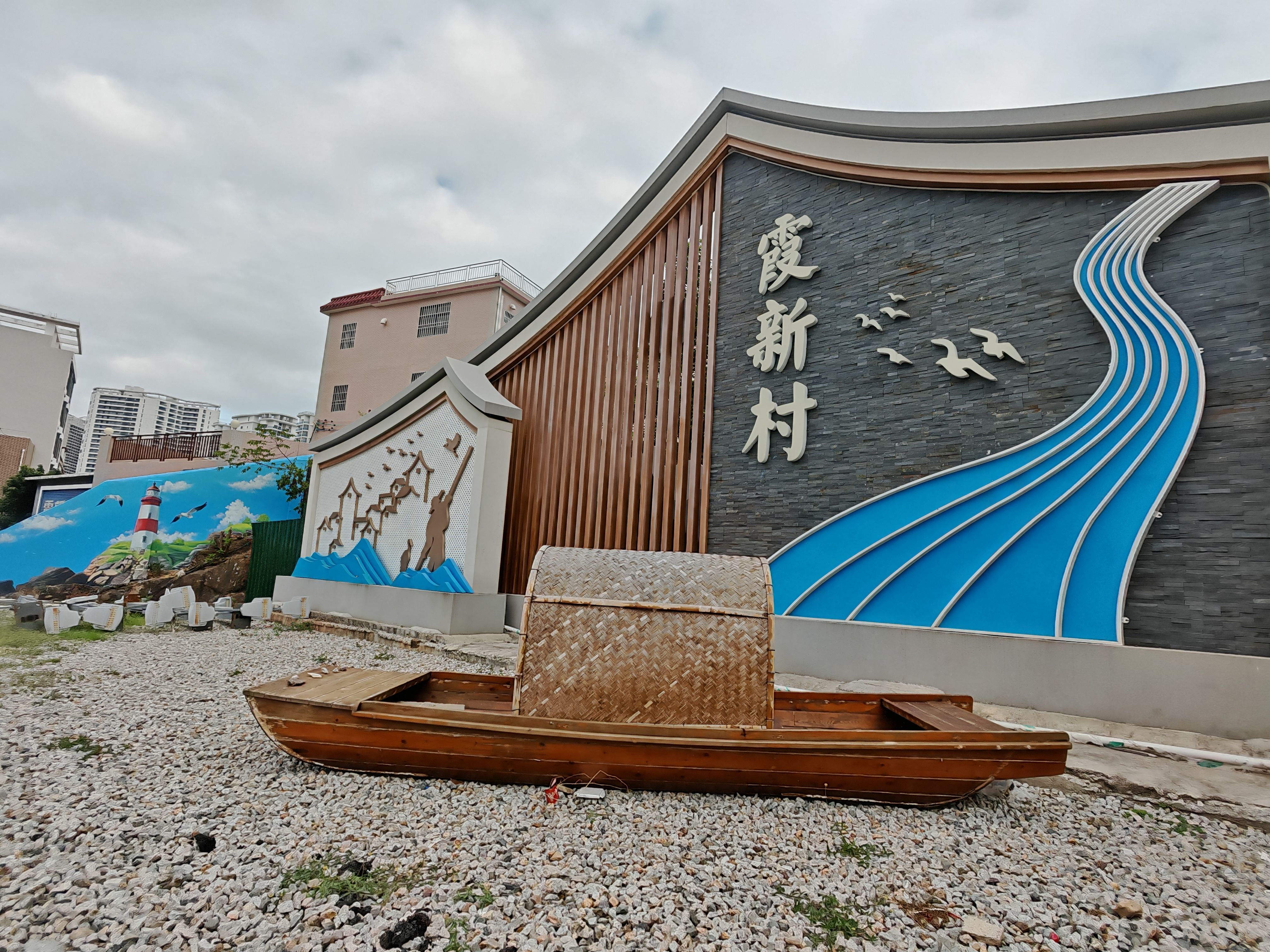 沿著海韻廣場穿過霞新橋,霞新村螺島下的入口處率先帶來驚喜。這里新添了一處醒目的村莊標(biāo)識,整體風(fēng)格以藍白灰黃為主色調(diào),旁邊的山墻則巧妙畫上了漁村特色墻繪——燈塔矗立、海鳥翩飛,F(xiàn)場還特意擺放了一艘漁船模型,與墻體彩繪相映成趣,還原了傳統(tǒng)漁村的質(zhì)樸風(fēng)貌。而旁邊的登山步道則被巧妙設(shè)計成鋼琴鍵造型,搭配“好好生活、慢慢遇見”“喜歡你的,就叫你霞涌”等暖心文案,讓每一步前行都充滿儀式感。
