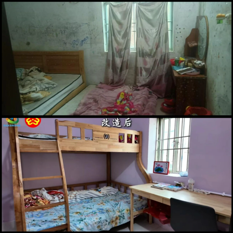 針對(duì)這些實(shí)際問題,改造團(tuán)隊(duì)用心改造:為小雨家修補(bǔ)墻面、更換窗戶與上下床,添置書桌衣柜;給小星家的房間刷白煥新,配齊床品與學(xué)習(xí)用具;為小年家搭建輕便隔墻,劃分出獨(dú)立學(xué)習(xí)區(qū)——通過細(xì)心改造,為孩子們創(chuàng)造了一個(gè)良好的居住、學(xué)習(xí)和個(gè)人生活空間,實(shí)現(xiàn)空間與兒童心理的雙重?zé)ㄐ隆?