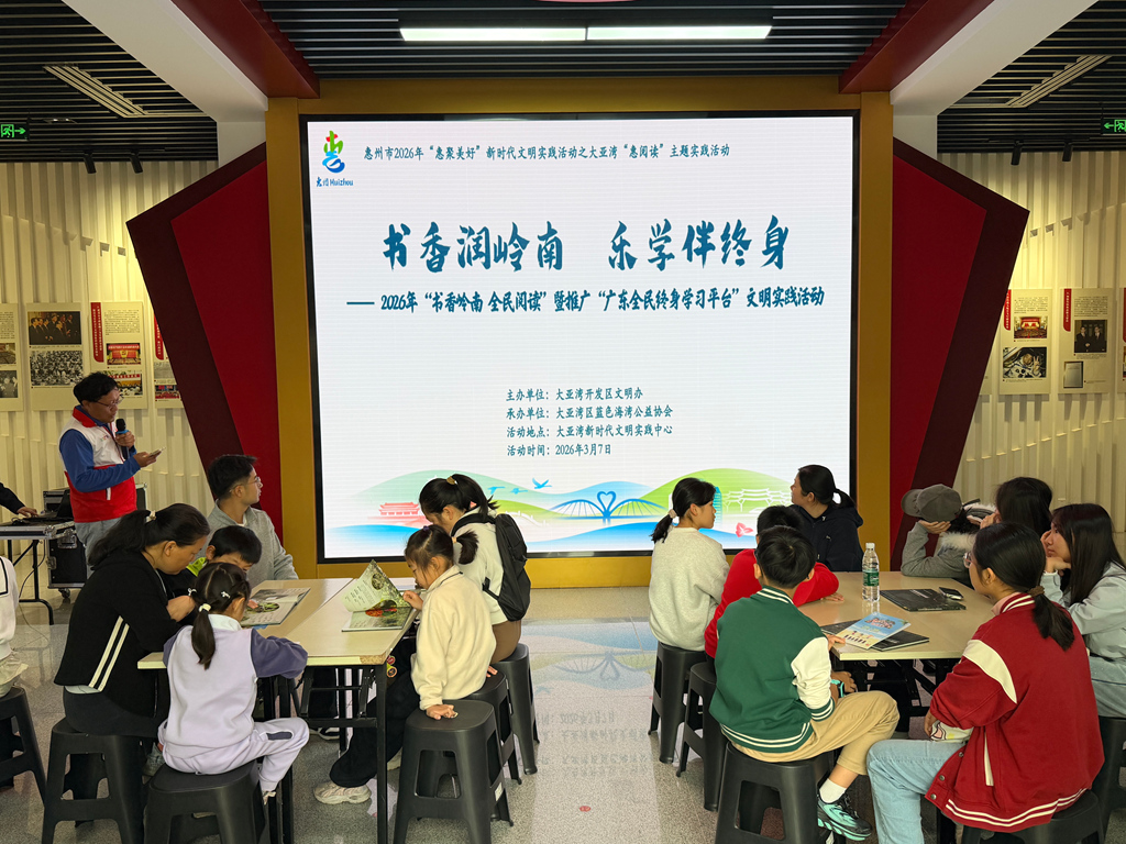 三月嶺南,春意盎然,書香氤氳。為深入推進全民閱讀,建設書香嶺南,同時推廣“廣東全民終身學習平臺”,倡導終身學習理念,3月7日上午,由大亞灣開發(fā)區(qū)文明辦主辦,大亞灣區(qū)藍色海灣公益協(xié)會承辦的 “書香潤嶺南 樂學伴終身”——2026年“書香嶺南 全民閱讀”暨“廣東全民終身學習平臺”推廣文明實踐活動在大亞灣新時代文明實踐中心舉行;顒訉⑸鷳B(tài)科普、親子手作與數(shù)字閱讀推廣巧妙融合,吸引了轄區(qū)內(nèi)眾多居民熱情參與。