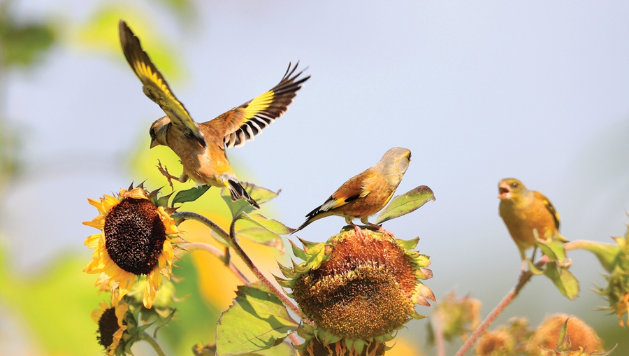 站在葵花上的金翅雀熟練準確地啄下葵花籽,用特有的喙輕松剝去外殼,吃下雪白的瓜子仁,整個動作一氣呵成,非?蓯邸=鸪崛革w舞時,展開的黃色翅膀非常耀眼,與葵花的黃色交相輝映,繪就一幅幅完美的畫作,更讓葵園充滿了勃勃生機。