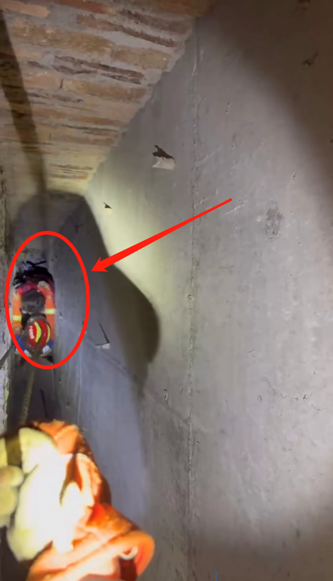 消防救援人員到達(dá)現(xiàn)場后,第一時間對現(xiàn)場進(jìn)行偵查,發(fā)現(xiàn)小朋友掉落在一個約40厘米寬,10米深的夾縫當(dāng)中,夾縫上方還有一塊水泥板,增加了救援難度,現(xiàn)場指揮員立即組織制作支點(diǎn),利用五點(diǎn)式吊帶進(jìn)行救援。