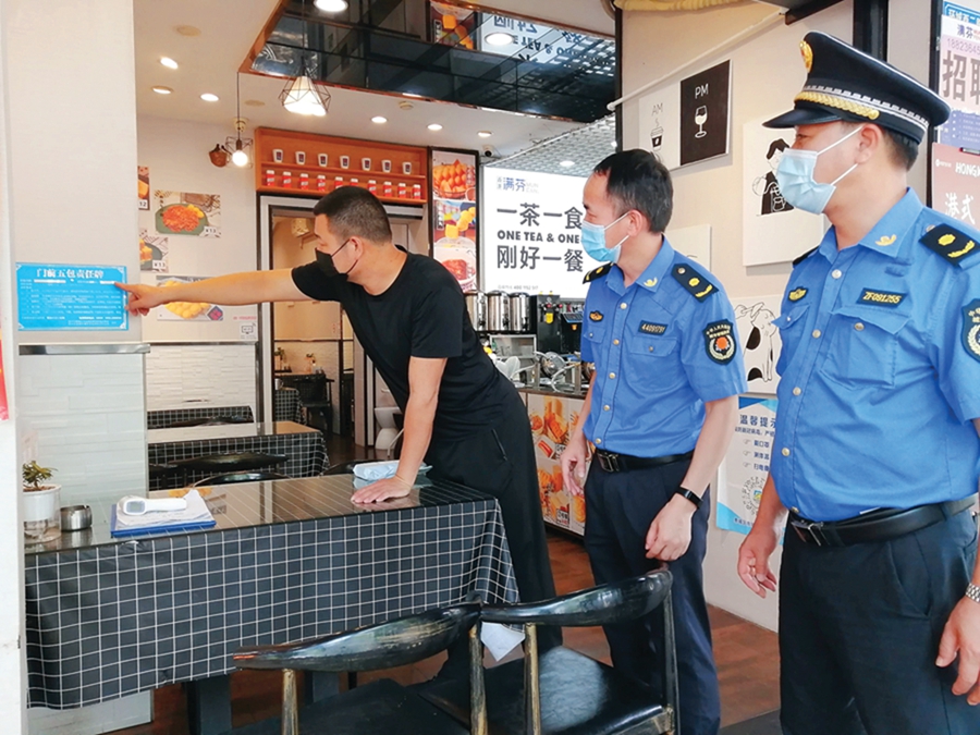 城管執(zhí)法人員在檢查市區(qū)臨街商鋪“門前五包”責任制落實情況。