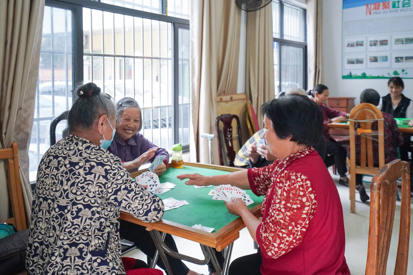 改造后的群芳苑,老人們?cè)诶先嘶顒?dòng)中心打牌消遣。
