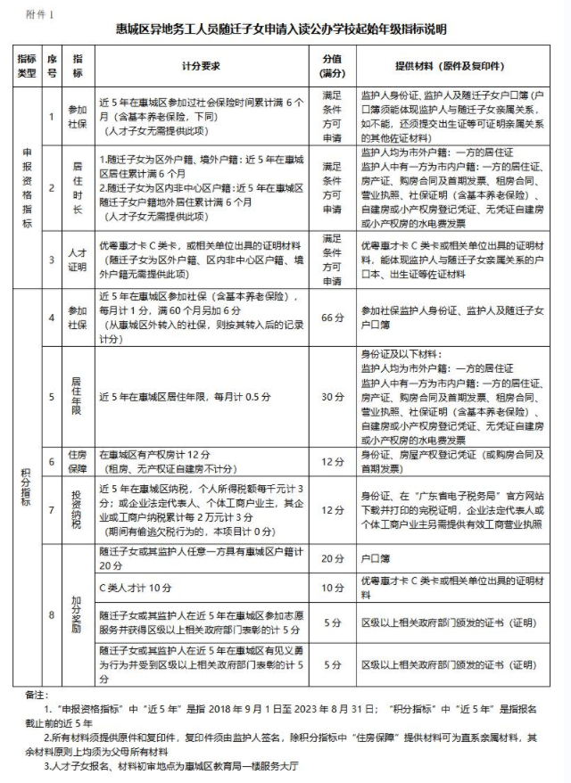 1.惠城區(qū)異地務工人員隨遷子女申請入讀公辦學校起始年級指標說明