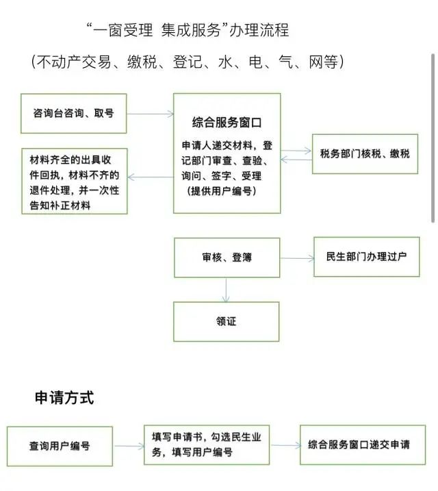 群眾申請(qǐng)——綜合服務(wù)窗口受理(一次性收取不動(dòng)產(chǎn)登記、用水、用電、用氣、用網(wǎng)、維修基金業(yè)務(wù)所需的申請(qǐng)材料)——審批登簿(同時(shí)將用氣、用網(wǎng)、維修基金業(yè)務(wù)受理信息和收件材料分別共享給供水、供電、燃?xì)、廣電網(wǎng)絡(luò)、維修基金管理部門)——民生部門依據(jù)共享信息和材料辦理過(guò)戶。最終實(shí)現(xiàn)“一窗受理、分類審核、集成服務(wù)”。