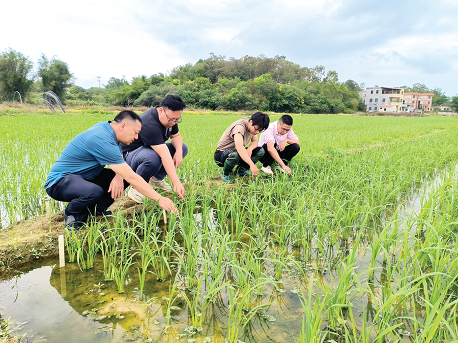 農(nóng)技人員深入田間地頭了解作物生長(zhǎng)情況。 惠州日?qǐng)?bào)記者謝菁菁 通訊員嚴(yán)學(xué)東 許建輝 攝
