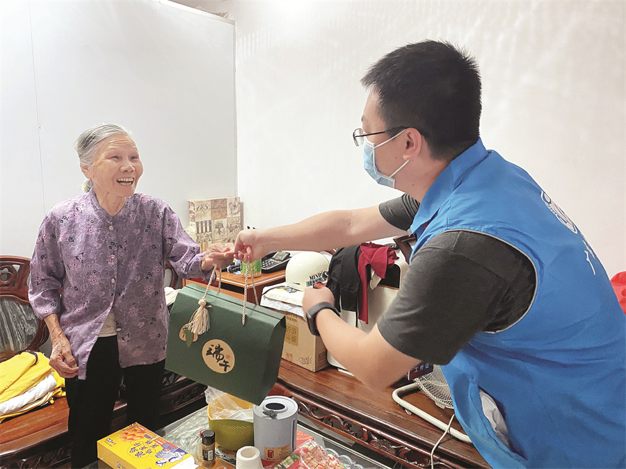 “雙百”社工給困難群眾送上愛心物資。