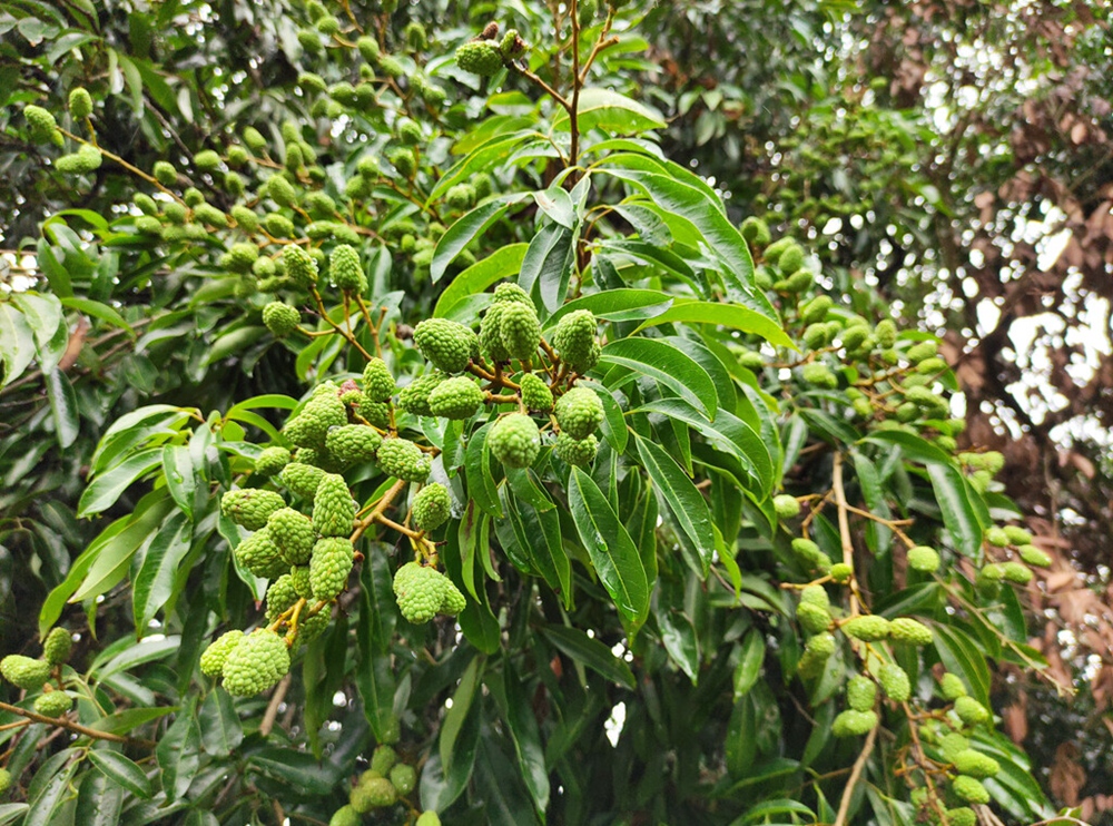 古荔枝樹依然枝葉依然茂盛,枝頭掛滿果實。