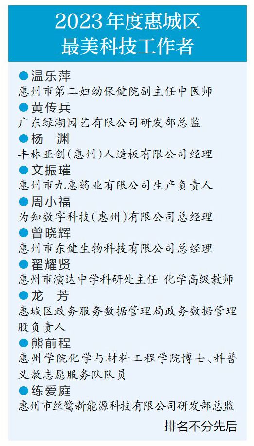 活動中,惠城區(qū)2023年度“最美科技工作者”評選結果出爐,10位“最美科技工作者”獲此殊榮。他們聚焦前沿科學問題和關鍵技術的突破,努力成為服務經濟社會高質量發(fā)展的推動者,成為助推科技自立自強的排頭兵。接下來,還將舉薦優(yōu)秀科技工作者參評區(qū)拔尖人才、惠州市“天鵝計劃”“廣東省丁穎科技獎”等評選活動。