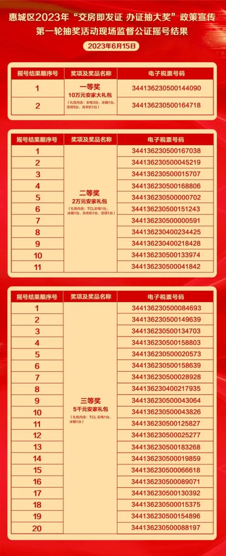 6月15日,2023年惠城區(qū)“交房即發(fā)證 辦證抽大獎(jiǎng)”政策宣傳抽獎(jiǎng)活動(dòng)第一輪直播抽獎(jiǎng)在惠奧·梵高的花園舉行,并通過惠州頭條APP進(jìn)行視頻在線直播。在惠州市陽(yáng)光公證處公證員的全程監(jiān)督以及逾15萬在線觀眾的圍觀下共抽出了33名幸運(yùn)中獎(jiǎng)人,包括一等獎(jiǎng)2名,二等獎(jiǎng)11名,三等獎(jiǎng)20名,其中一等獎(jiǎng)的中獎(jiǎng)?wù)攉@得10萬元安家大禮包。