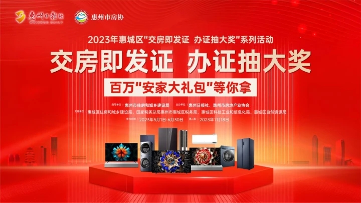 惠城區(qū)2023年“交房即發(fā)證 辦證抽大獎(jiǎng)”政策宣傳抽獎(jiǎng)活動(dòng)在惠州市住房和城鄉(xiāng)建設(shè)局指導(dǎo)下,由惠城區(qū)住房和城鄉(xiāng)建設(shè)局、國家稅務(wù)總局惠州市惠城區(qū)稅務(wù)局、惠城區(qū)科技工業(yè)和信息化局、惠城區(qū)自然資源局提供支持,惠州日報(bào)社與惠州市房地產(chǎn)業(yè)協(xié)會聯(lián)合主辦,旨在推進(jìn)“交房即發(fā)證”這一便民措施,更好地保障購房者的合法權(quán)益,不斷提升購房、交稅、辦證等環(huán)節(jié)的便利性、滿意度。