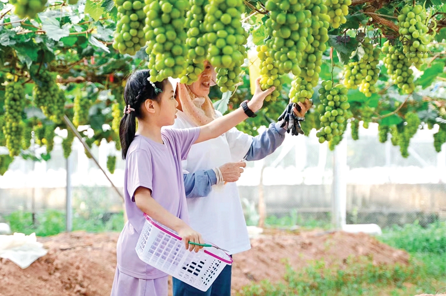 游客在葡萄園采摘陽光玫瑰葡萄。
