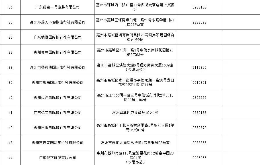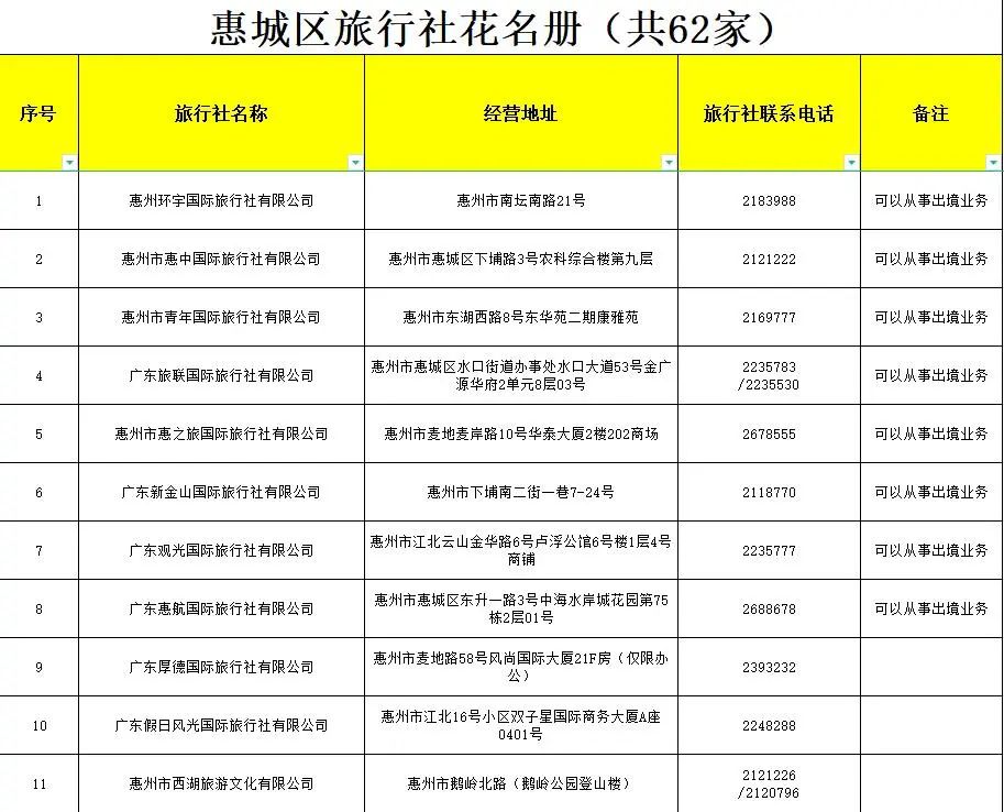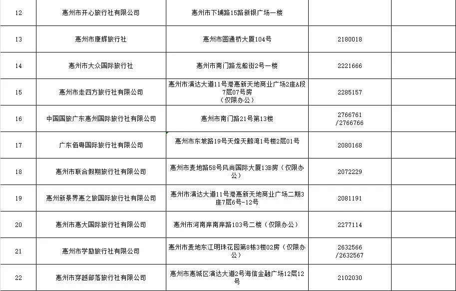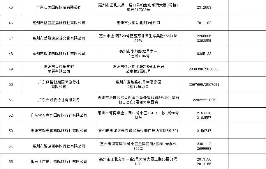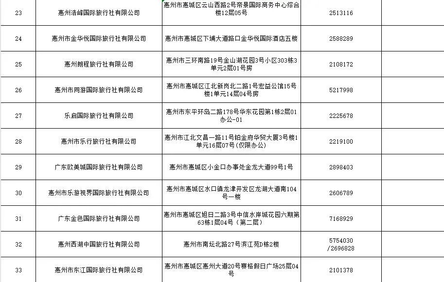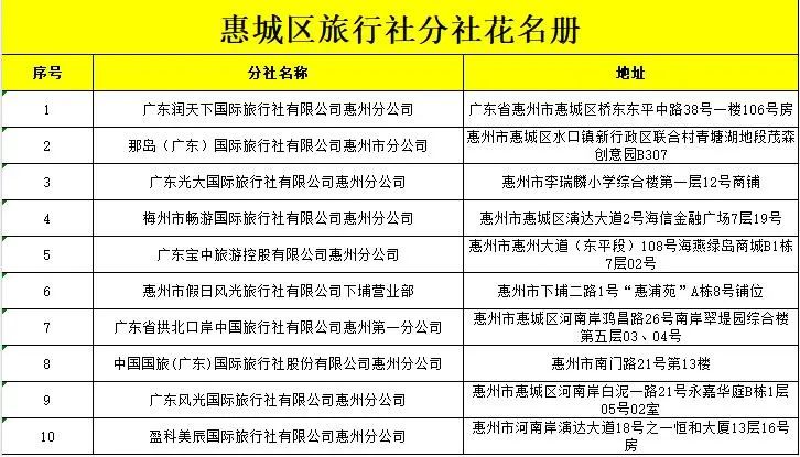 當(dāng)前,惠城區(qū)注冊(cè)備案的旅行社及分社名單如下: