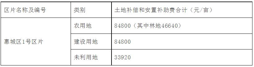土地補(bǔ)償費(fèi)和安置補(bǔ)助費(fèi)按《惠州市人民政府關(guān)于公布實(shí)施征收農(nóng)用地區(qū)片綜合地價的公告》(惠府公〔2021〕4號)規(guī)定的惠城區(qū)1號區(qū)片綜合地價標(biāo)準(zhǔn)執(zhí)行,其中全市統(tǒng)一設(shè)定林地調(diào)節(jié)系數(shù)0.55,征收建設(shè)用地參照征收農(nóng)用地區(qū)片綜合地價執(zhí)行,征收未利用地參照征收農(nóng)用地區(qū)片綜合地價設(shè)定調(diào)節(jié)系數(shù)0.4執(zhí)行。