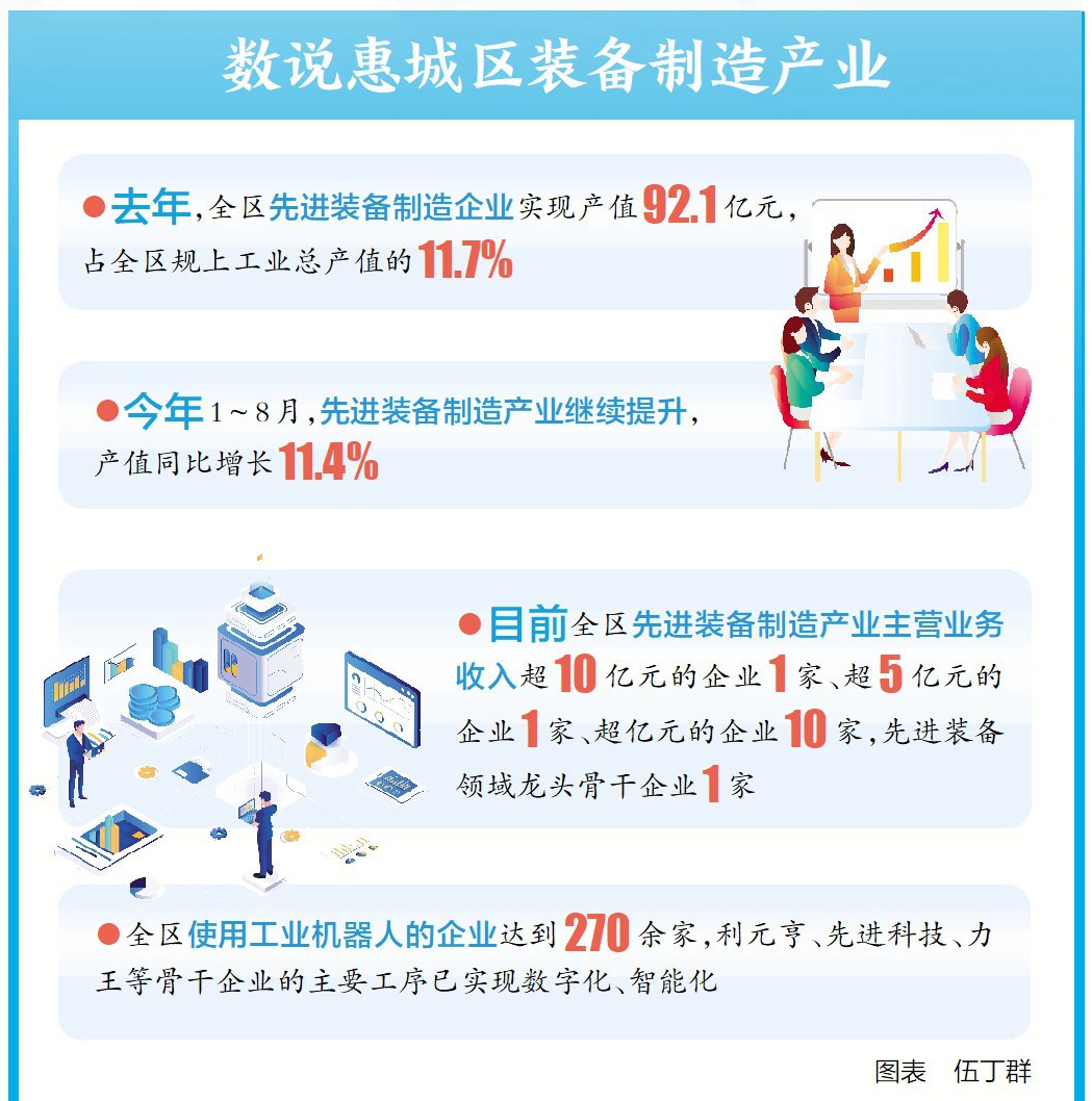 擁有競爭力強的裝備制造產(chǎn)業(yè)集群是制造業(yè)高質(zhì)量發(fā)展的重要標(biāo)志之一。近年來,惠城區(qū)高度重視,將裝備制造產(chǎn)業(yè)列為“3+3+X”產(chǎn)業(yè)體系的主導(dǎo)產(chǎn)業(yè),提出要發(fā)揮傳統(tǒng)優(yōu)勢,堅持內(nèi)外源并重、引進(jìn)與培育并舉,打造裝備制造產(chǎn)業(yè)高地。去年,先進(jìn)裝備制造企業(yè)實現(xiàn)產(chǎn)值92.1億元,占全區(qū)規(guī)上工業(yè)總產(chǎn)值的11.7%。今年1~8月,先進(jìn)裝備制造產(chǎn)業(yè)發(fā)展繼續(xù)提速,產(chǎn)值同比增長11.4%,產(chǎn)業(yè)初具規(guī)模。