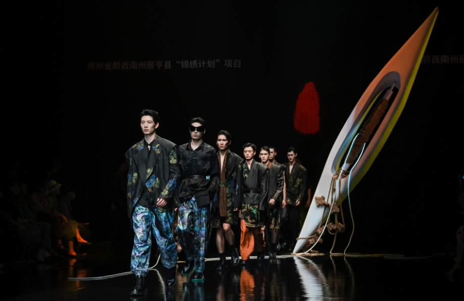 黃剛介紹:“‘錦繡中華’系列服裝能夠體現‘錦繡計劃’的初衷,冊亨有很多繡娘,還有做蠟染、吊染、扎染的一些匠人,他們設計制作的產品比較特別,我們把民族元素用到時尚的設計里,讓非遺跟現代結合、跟科技結合,于是有了今天精彩的呈現!