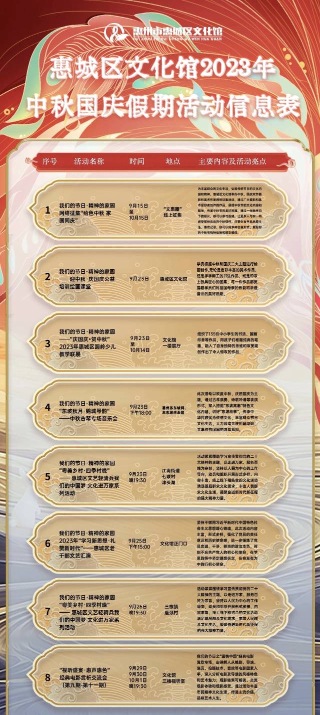 更多詳細(xì)安排請(qǐng)關(guān)注微信公眾號(hào)“惠州市惠城區(qū)文化館”。