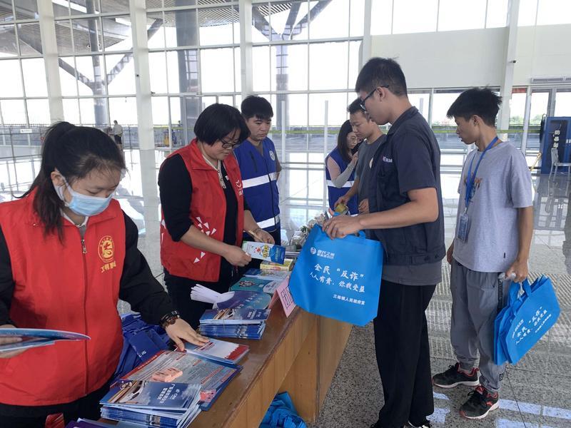 志愿者為旅客送上法治宣傳資料;葜萑請笥浾吲砑t霞 通訊員黃美琳 攝