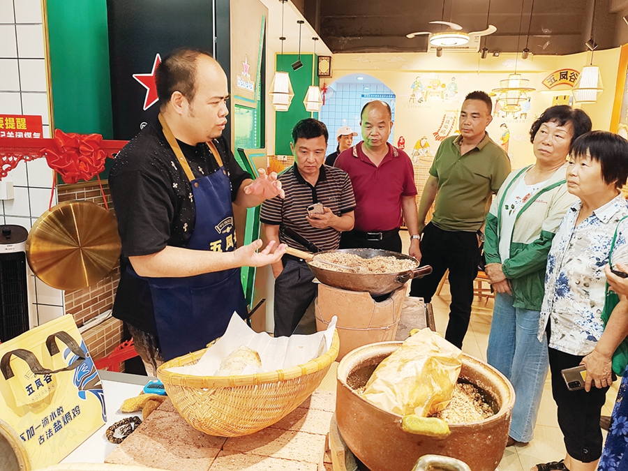 五鳳谷古法鹽焗雞負責(zé)人吳金標(biāo)與客人分享鹽焗雞。