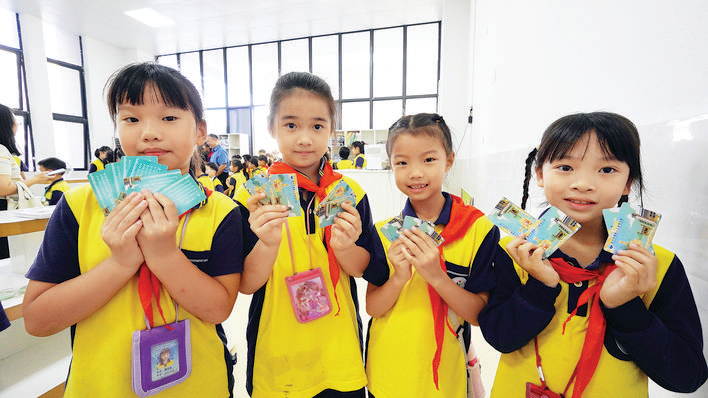惠州市南壇小學(xué)鼎峰分校校長(zhǎng)張?jiān)裸懜嬖V記者,開(kāi)設(shè)“鼎一兌換超市”主要是為創(chuàng)新學(xué)校的激勵(lì)機(jī)制,同時(shí)開(kāi)展學(xué)生職業(yè)體驗(yàn),培養(yǎng)學(xué)生的理財(cái)意識(shí)。孩子們手里拿的“鼎一幣”看起來(lái)類似一張銀行卡,上面有包含該!岸σ弧蔽幕瘍(nèi)涵的漫畫(huà)設(shè)計(jì)!拔覀儗iT成立‘鼎一幣’設(shè)計(jì)項(xiàng)目組,面向師生和家長(zhǎng)征集設(shè)計(jì)圖案,不少作品設(shè)計(jì)巧妙,經(jīng)過(guò)我們辦公室和美術(shù)科組的評(píng)選,最終三年級(jí)1班吳雨微同學(xué)的作品當(dāng)選!睂W(xué)校制作了上萬(wàn)張卡,每個(gè)月為學(xué)校每位教職員工發(fā)放100張“鼎一幣”,大家可根據(jù)自己的標(biāo)準(zhǔn)去獎(jiǎng)勵(lì)學(xué)生!盀榱梭w現(xiàn)全員育人的理念,我們學(xué)校的保潔、保安都可以給表現(xiàn)優(yōu)秀的孩子發(fā)幣!睆?jiān)裸懡榻B說(shuō),超市的獎(jiǎng)品都是孩子們喜歡的文體用品,有的是學(xué)校購(gòu)買,有的是愛(ài)心家長(zhǎng)捐贈(zèng),還加入了免作業(yè)券、和校長(zhǎng)合影券等精神方面的獎(jiǎng)勵(lì)。