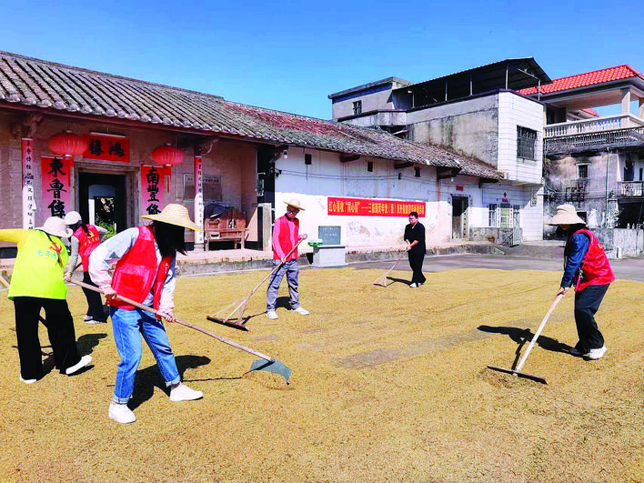 黨群一起晾曬稻谷。 惠州日?qǐng)?bào)記者彭紅霞 通訊員鄭艷芳 李曼琦 攝