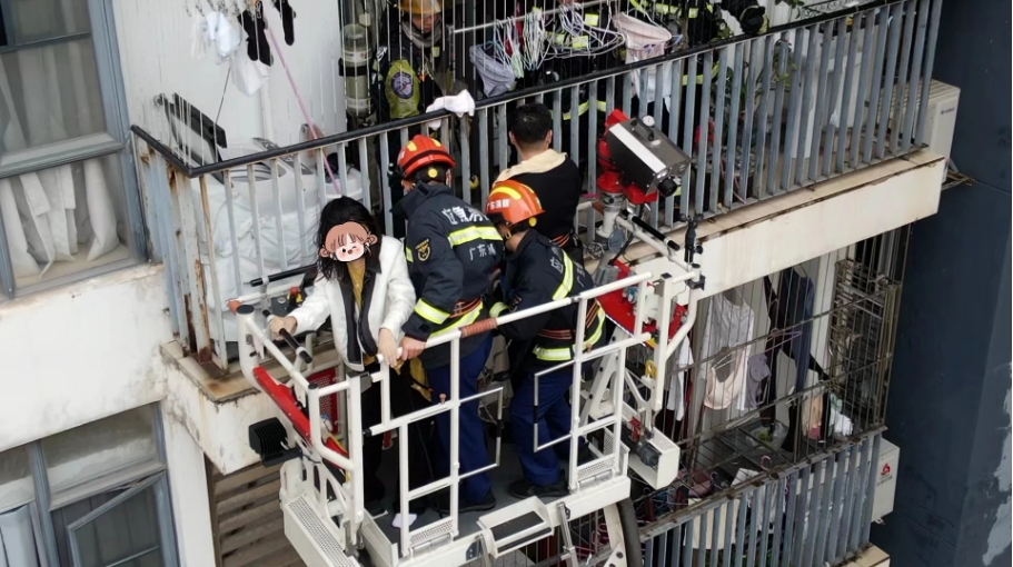 指揮員到場后,經(jīng)過詢問知情人和現(xiàn)場偵查,發(fā)現(xiàn)兩名被困群眾在房間內(nèi),另外兩名被困群眾在陽臺。情況萬分危急。消防指揮員當即命令舉高噴射車伸到高層陽臺外圍出水控火,阻止火勢向上蔓延,同時組織救援人員內(nèi)攻滅火并搜救被困人員。約15分鐘后,成功解救4名被困人員。同時,消防員對起火房間展開滅火救援,經(jīng)過近半小時左右緊急處置,明火被完全撲滅。